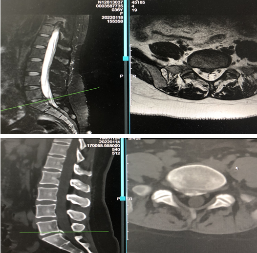 Luckily, she was diagnosed by the team of Dr. Fu Qiang. On admission, the patient was found to have a fibrosarcoma with possible systemic metastasis, poor condition, a large disc prolapse between L5-S1 of his lumbar spine combined with significant calcification, and severe neural adhesions in the lumbar spinal canal.