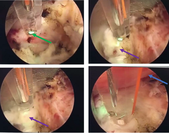 The surgical team discussed that conventional open lumbar fusion surgery is a major operation. If an open lumbar fusion approach is implemented, the process of forcibly removing the disc and separating the adherent tissues will greatly increase the risk of intraoperative nerve injury and postoperative infection may occur. After careful evaluation and communication with the patient and her family, the expert team decided to treat her with a full spinal endoscopy combined with dedicated laser surgery through the intervertebral plate.