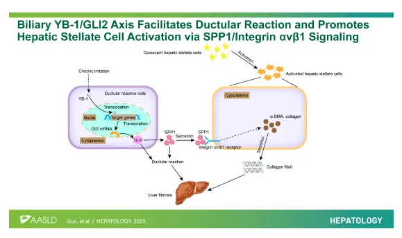 Taken together, these findings indicate that the YB-1/GLI2 axis drives DRC proliferation and SPP1 secretion, which in turn promotes HSC activation through integrin αvβ1 signaling, thereby advancing hepatic fibrogenesis. This suggests that the YB-1/GLI2/SPP1 pathway may represent a potential therapeutic target for liver fibrosis.