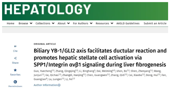 Recently, the research team led by Professor Lu Lungen from the Department of Gastroenterology, Shanghai General Hospital, published an article entitled “Biliary YB-1/GLI2 axis facilitates ductular reaction and promotes hepatic stellate cell activation via SPP1/Integrin αvβ1 signaling during liver fibrogenesis” in Hepatology (Impact Factor: 15.8), a leading international journal in the field of hepatology. The study reveals a novel mechanism of cellular interaction between ductular reaction cells (DRCs) and hepatic stellate cells (HSCs) in promoting liver fibrosis progression, providing new theoretical insights for the prevention and treatment of liver fibrosis.